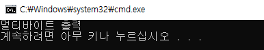 123456789#include <stdio.h>int main() {char* a = "멀티바이트 출력\n";wchar_t* b = L"유니코드 출력\n";printf(a);wprintf(b);}cs 결과