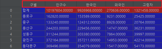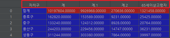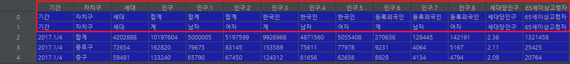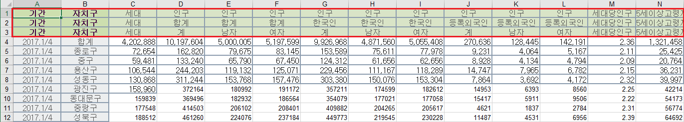1234567891011121314151617181920import pandas as pd# 엑셀 데이터 불러오기pop_Seoul = pd.read_excel('population_in_Seoul.xls', encoding='utf-8') #엑셀 파일을 읽음data1 = pop_Seoul.head() #데이터의 첫 5행만 보여줌# 엑셀 데이터 불러오기 - 컬럼을 3번째 줄부터 읽고 원하는 열만 읽도록 하기pop_Seoul = pd.read_excel('population_in_Seoul.xls',header=2, # 컬럼은 3번째 줄부터 읽으라는 의미usecols='B, D, G, J, N', # B, D, G, J, N 열만 읽도록 한다.encoding='utf-8')data2 = pop_Seoul.head()# 컬럼명 변경하기pop_Seoul.rename(columns = {pop_Seoul.columns[0] : '구별',pop_Seoul.columns[1] : '인구수',pop_Seoul.columns[2] : '한국인',pop_Seoul.columns[3] : '외국인',pop_Seoul.columns[4] : '고령자', }, inplace=True)data3 = pop_Seoulcs 엑셀 파일 내용