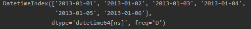 Index(['A', 'B', 'C', 'D'], dtype='object')DatetimeIndex(['2013-01-01', '2013-01-02', '2013-01-03', '2013-01-04',