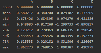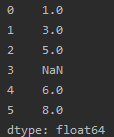 12345678910111213141516171819import pandas as pdimport numpy as np# Series - 대괄호로 만드는 파이썬의 list 데이터로 만들 수 있다.s = pd.Series([1,3,5,np.nan,6,8])print(s)# 2013월 01월 01일 부터 6일 동안의 데이터를 저장dates = pd.date_range('20130101', periods=6)print(dates)# 6행 4열의 random 변수를 만들고 columns=['A','B','C','D']로 지정, index는 2013월 01월 01일 부터 6일 동안의 데이터df = pd.DataFrame(np.random.randn(6,4), index=dates, columns=['A','B','C','D'])print('-------------------------------------------')print(df.index) # DataFrame의 index정보 출력print(df.columns) # DataFrame의 column정보 출력print(df.values) # DataFrame의 Values정보 출력print(df.describe()) # DataFrame의 통계정 개요를 확인cs print(s) 출력 결과